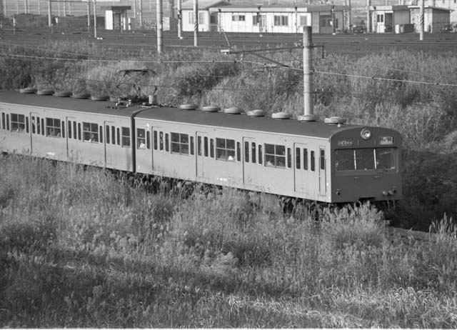 西船橋行きの武蔵野線電車と武蔵野操車場に点在する建物 中曽根陸橋上から吉川方向を見た風景